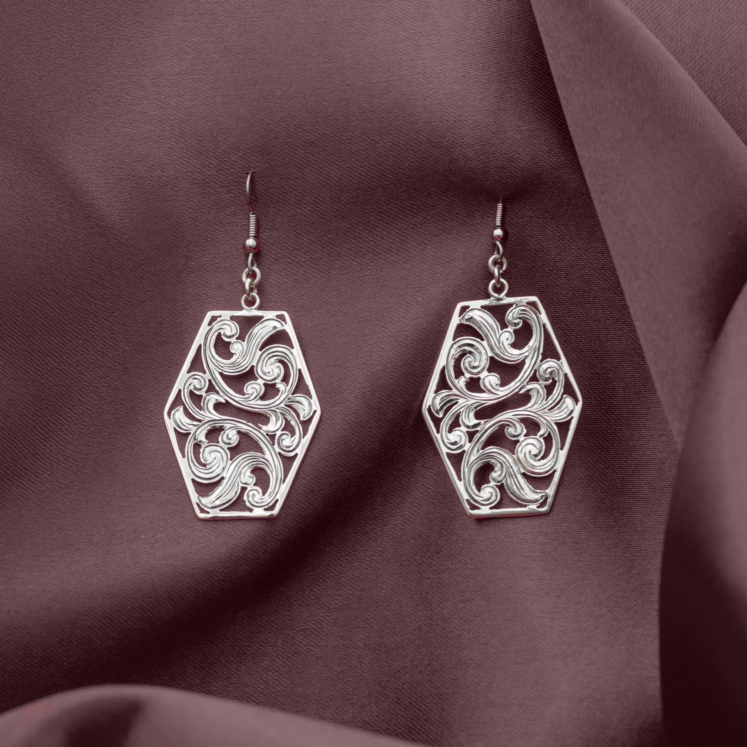 A unique hexagon shape creation measuring 1½" from top to bottom, these earrings feature fine hand-engraving that accents the hand-cut filigree pattern. The intricate open design offers a bold yet lightweight feel. Finished with sterling silver French hooks, they provide comfortable wear and natural movement throughout the day.