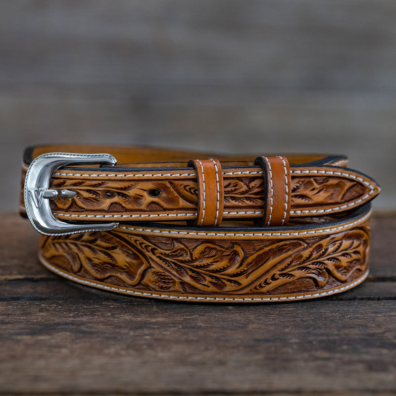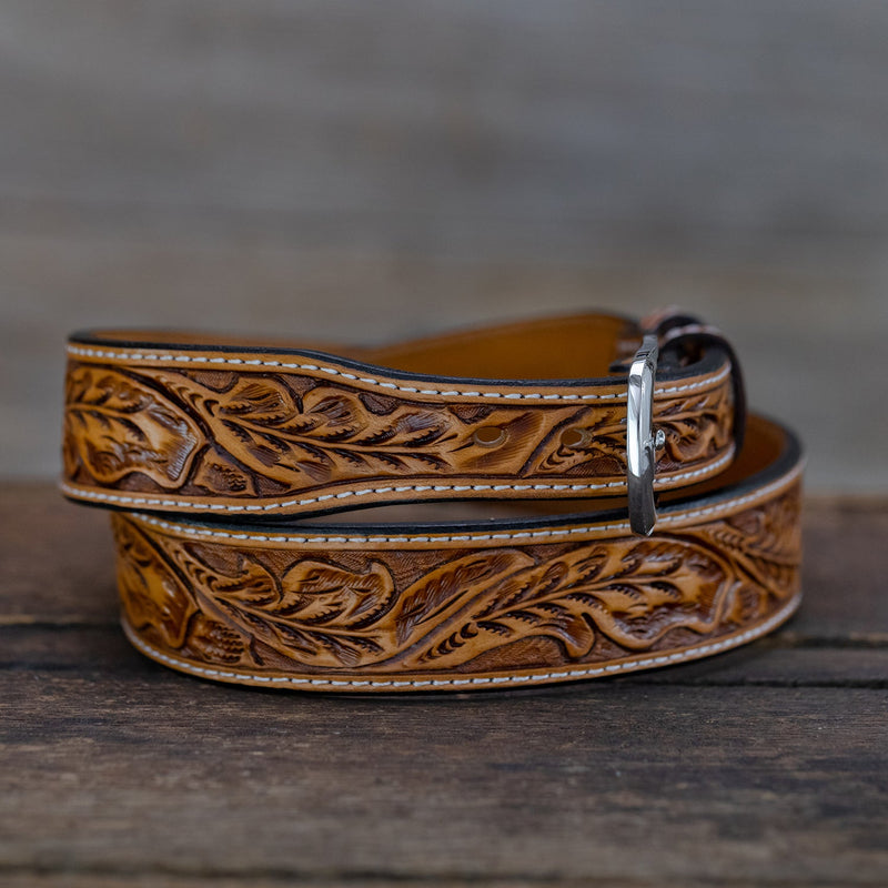 A beautifully hand-tooled design of elongated oak leaves set against a stippled background makes for a one-of-a-kind belt. Fully hand-crafted and made of rich American saddle leather, our belts are lined in top-grain leather and accented with fine stitching and hand-rubbed edges.