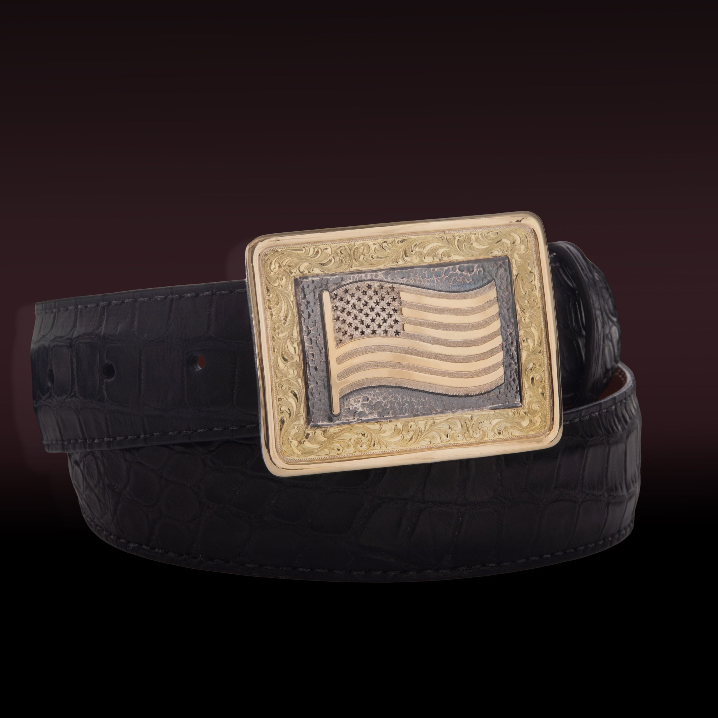 A LIMITED EDITION BUCKLE Created to commemorate 250 years of American Independence, this 3" buckle is framed with a fourteen karat yellow gold edge. At the center, the American flag features hand-engraved stars, 18 karat gold and sterling silver stripes, all set against a hand-engraved 14 karat gold background.
