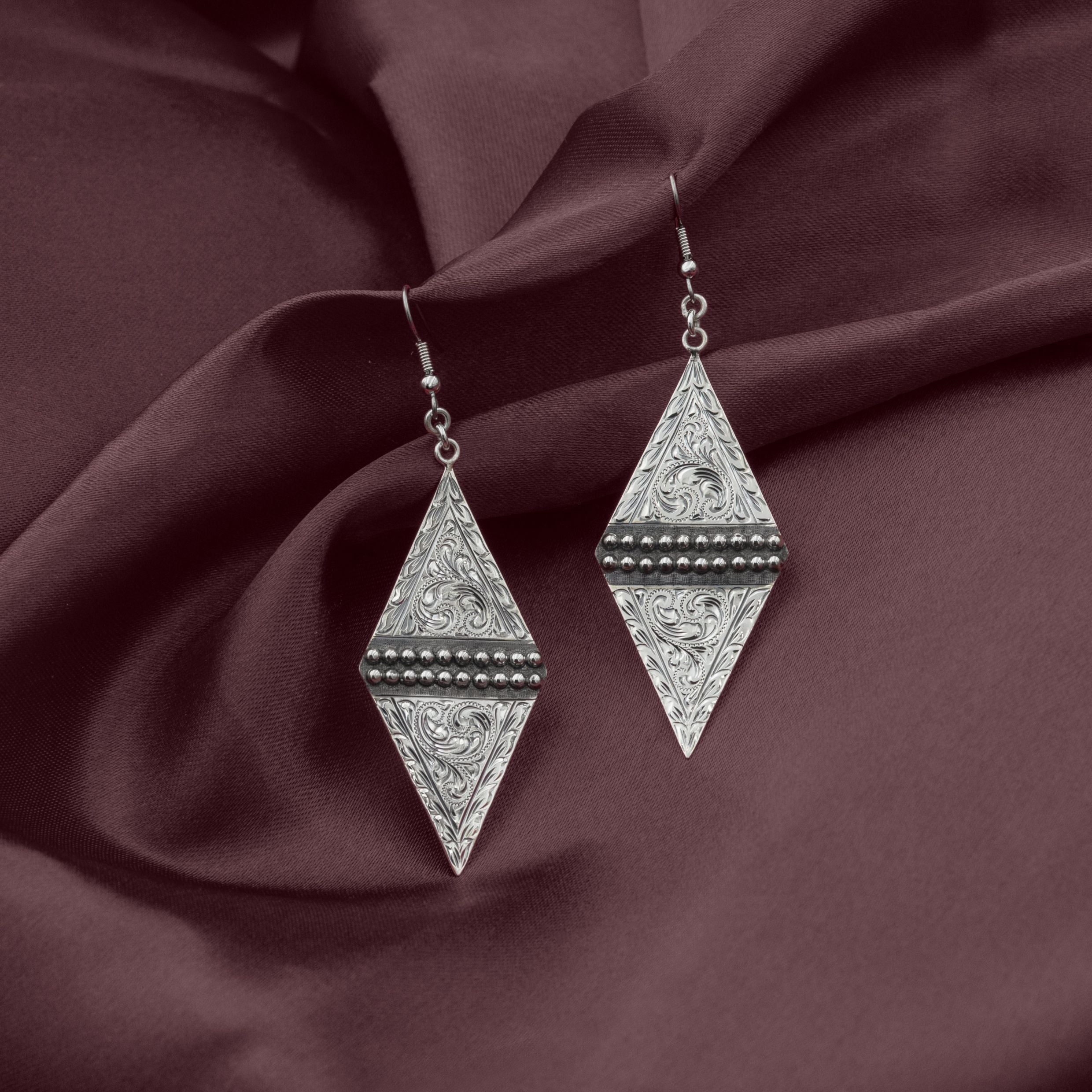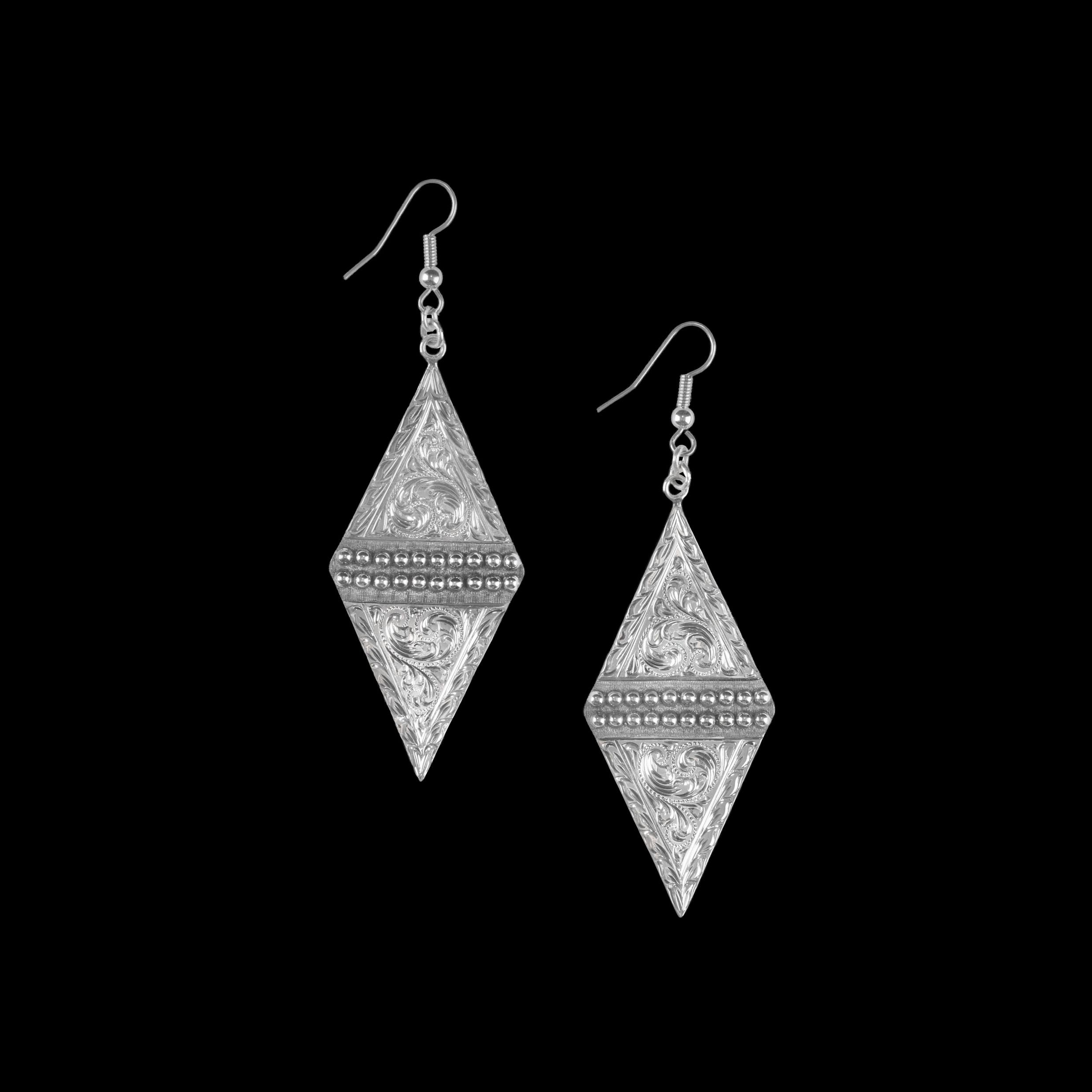 A bold diamond-shaped silhouette in sterling silver, this design features a leaf-engraved edge and two rows of polished sterling beads through the open center. Lightweight and easy to wear, the earrings are finished with sterling silver French hooks for comfortable movement and a strong Western presence.