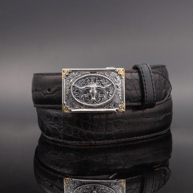 One of our most classic western designs, this trophy buckle is accented by beautiful 14 karat gold corners and immaculate hand engraving setting off the interior Longhorn figure.