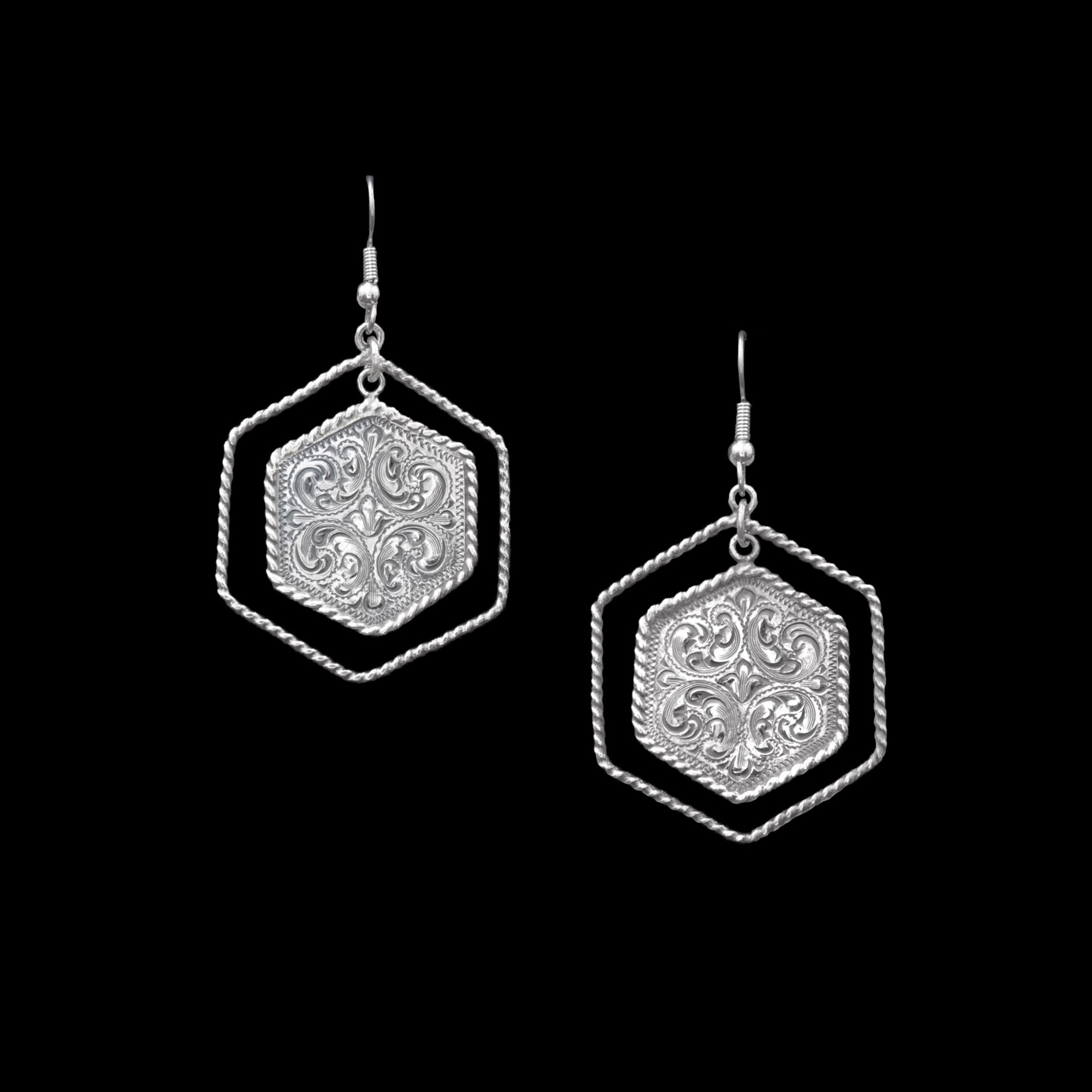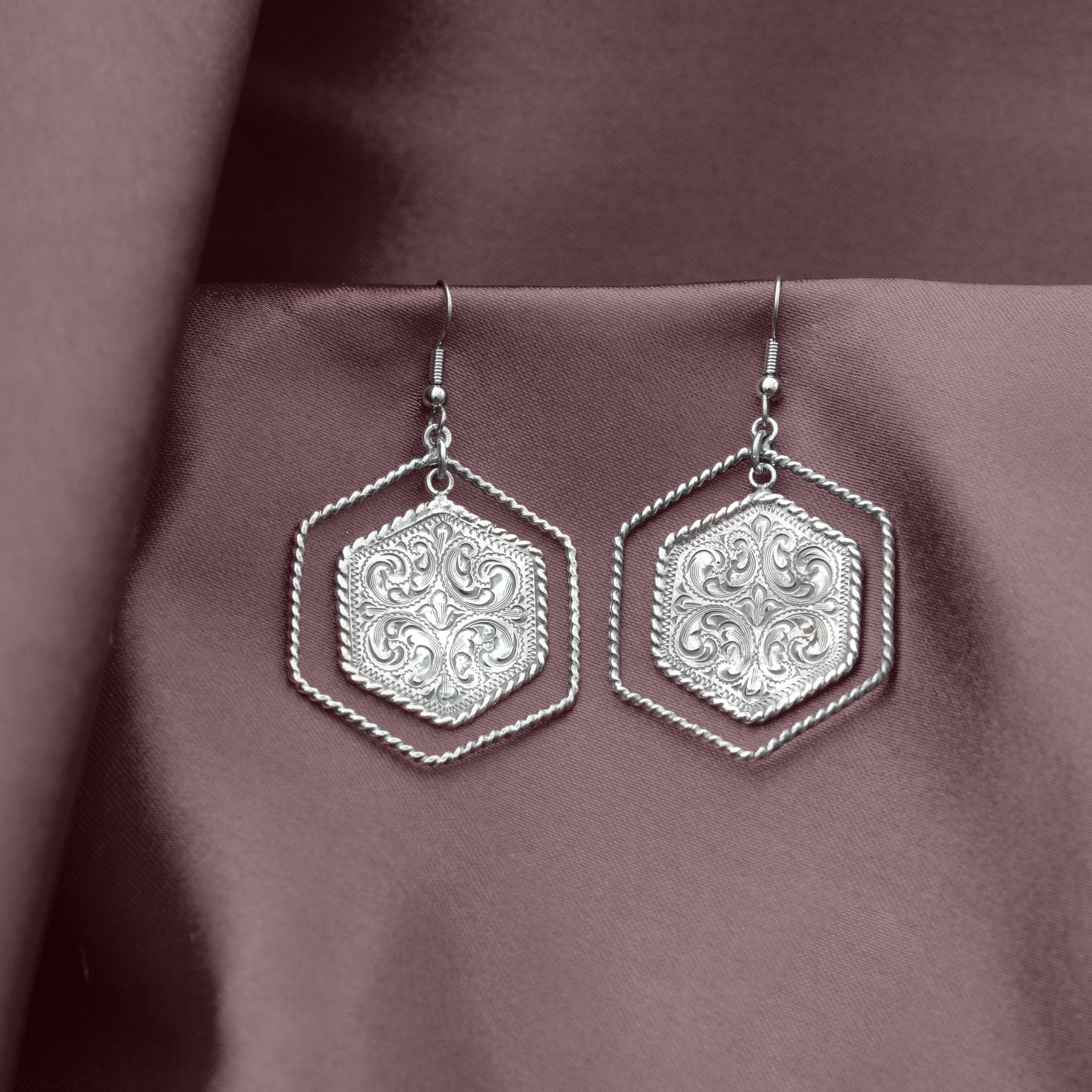 These sterling silver earrings feature a 1" hand-engraved hexagon disc framed with a hand-twisted rope edge and suspended inside a larger outer rope frame with a 5mm gap. The dimensional design offers a bold, structured look, finished with sterling French hooks for easy wear.
